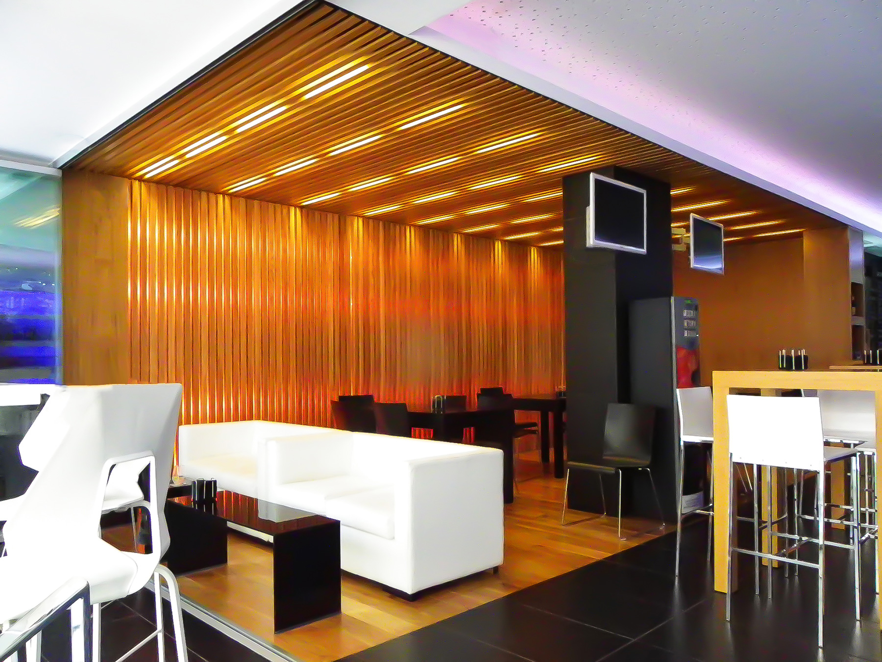 Debido a que el local de actuación se sitúa sobre una planta semi-sótano, es necesario realizar una intervención a nivel estructural en el forjado de planta para ejecutar unas escaleras que nos proporcionen acceso al restaurante. Aprovechando esta intervención se decide crear una terraza que permite desahogar dicho acceso la cual se separa del restaurante mediante un cerramiento de vidrio abatible y que permite la conexión total con el exterior, estableciendo en todo momento un diálogo entre el local y el exterior el cual queda potenciado con el uso de barandillas en la zona de la terraza a base de vidrio transparente.