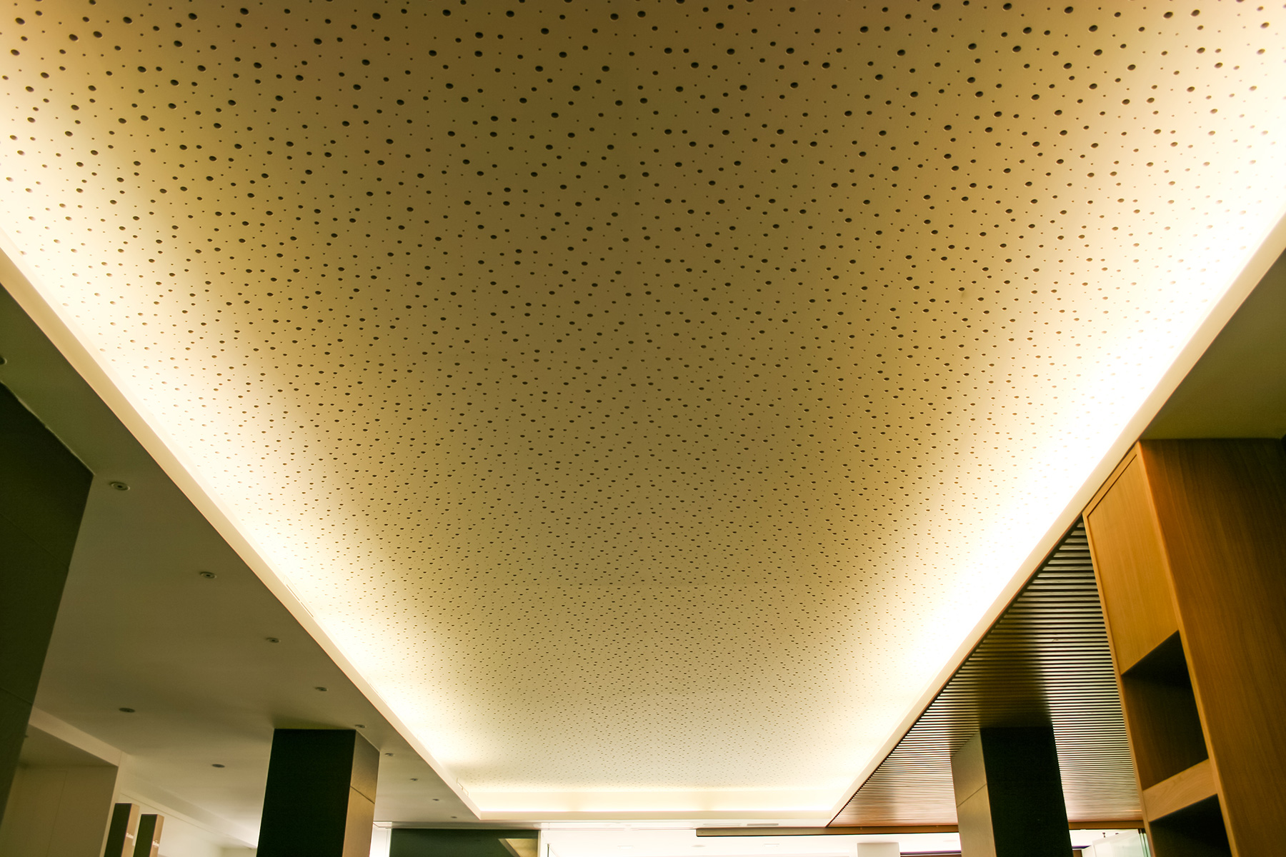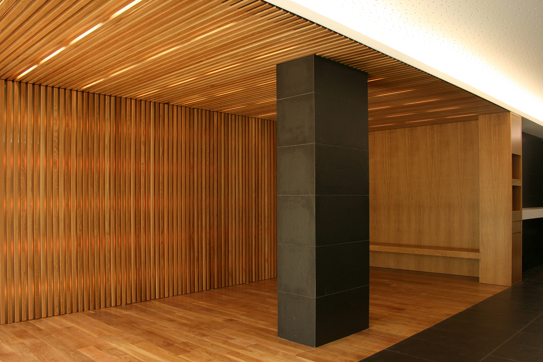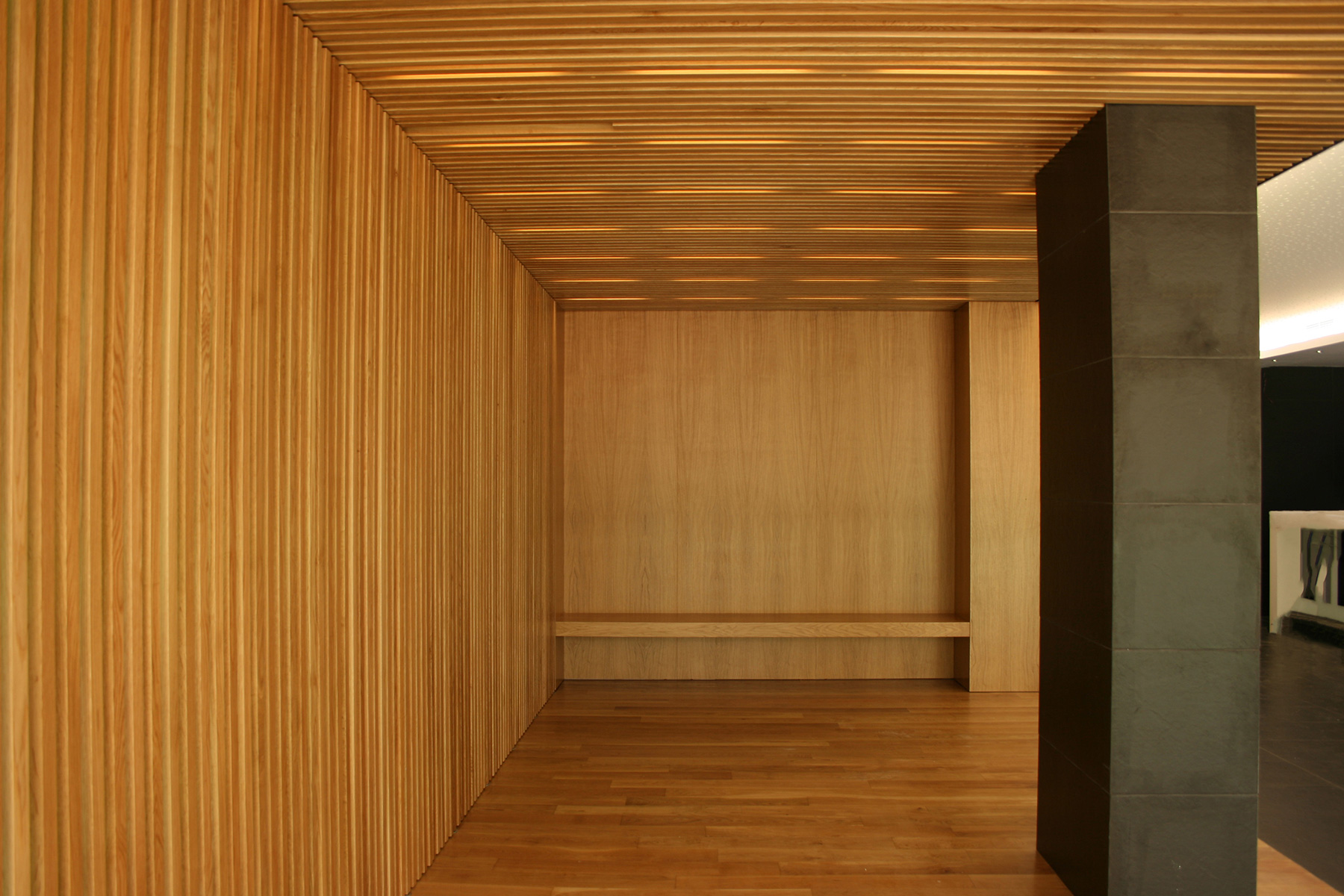 Se intenta no realizar una intervención violenta contra la fachada general del edificio, por lo que se plantea una intervención en fachada a modo de basamento del edificio utilizando chapa de acero lacado en oxicobre en consonancia con los materiales existentes en la fachada del edificio. Existen unas persianas enrollables que protegen el local del exterior cuando este está cerrado al público, potenciando más esa imagen a modo de basamento sobre la que apoya el edificio.